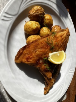 Nasze ?ryby z sieci? były wręcz wyśmienite. Serwowane z pieczonymi ziemniaczkami i bardzo smacznym zestawem surówek
